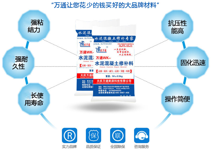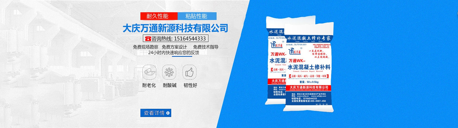 大慶萬通新源科技有限公司獨有的混凝土路面高強速補料,是水泥混凝土路面病害修復的好材料。疲勞、凍融循環(huán)、彎曲壓力、滲水和基層破壞等原因都會引起水泥路面的破損,從而帶來高昂的維護費用。與以往的剛性修補方法不同,混凝土水泥路面維修速補膠提供了一種獨特的柔性修補產品和技術,高柔性、高抗拉性,可跨伸縮縫施工和高抗壓性使得混凝土快補產品為水泥混凝土路面提供了******性的修補。傳統(tǒng)的剛性修補方案,如環(huán)氧砂漿和快干水泥產品,由于其自身的粘結失效,抗疲勞性低以及與原路面不同的伸縮系數(shù),修補面會在短時間內失效或產生新的裂縫,需要反復修補,有效期短且費用高昂。大慶萬通新源科技有限公司的混凝土水泥路面維修速補膠可以隨原路面一起伸縮,移動,從而避免了粘結失效和產生新裂縫。萬通快補產品優(yōu)異的粘結性、柔韌性和高防滑性,特別適用于水泥路面的淺層粘合修補,多邊角混凝土板層修補,跨伸縮縫修補以及路面沉陷修補。萬通混凝土病害修補料針對混凝土起皮起沙、斷板裂縫、蜂窩麻面、坑槽露石子、漏筋掉皮、橋梁的掉皮漏筋快速通車使用時間長。應用萬通快補產品,施工后一天就可以恢復交通。大慶萬通新源科技有限公司的萬通水泥路面維修速補膠適用于高速公路、機場路面、農村村村通路面、廠坪、學校操場、市區(qū)公路、小區(qū)路面、橋梁、水泥路面的修補。使用萬通特快補材料修補路面可以一勞永逸! 水泥地面起砂怎么辦,混凝土修補劑混凝土地面起砂,混凝土地面修補,地面起砂怎么辦,